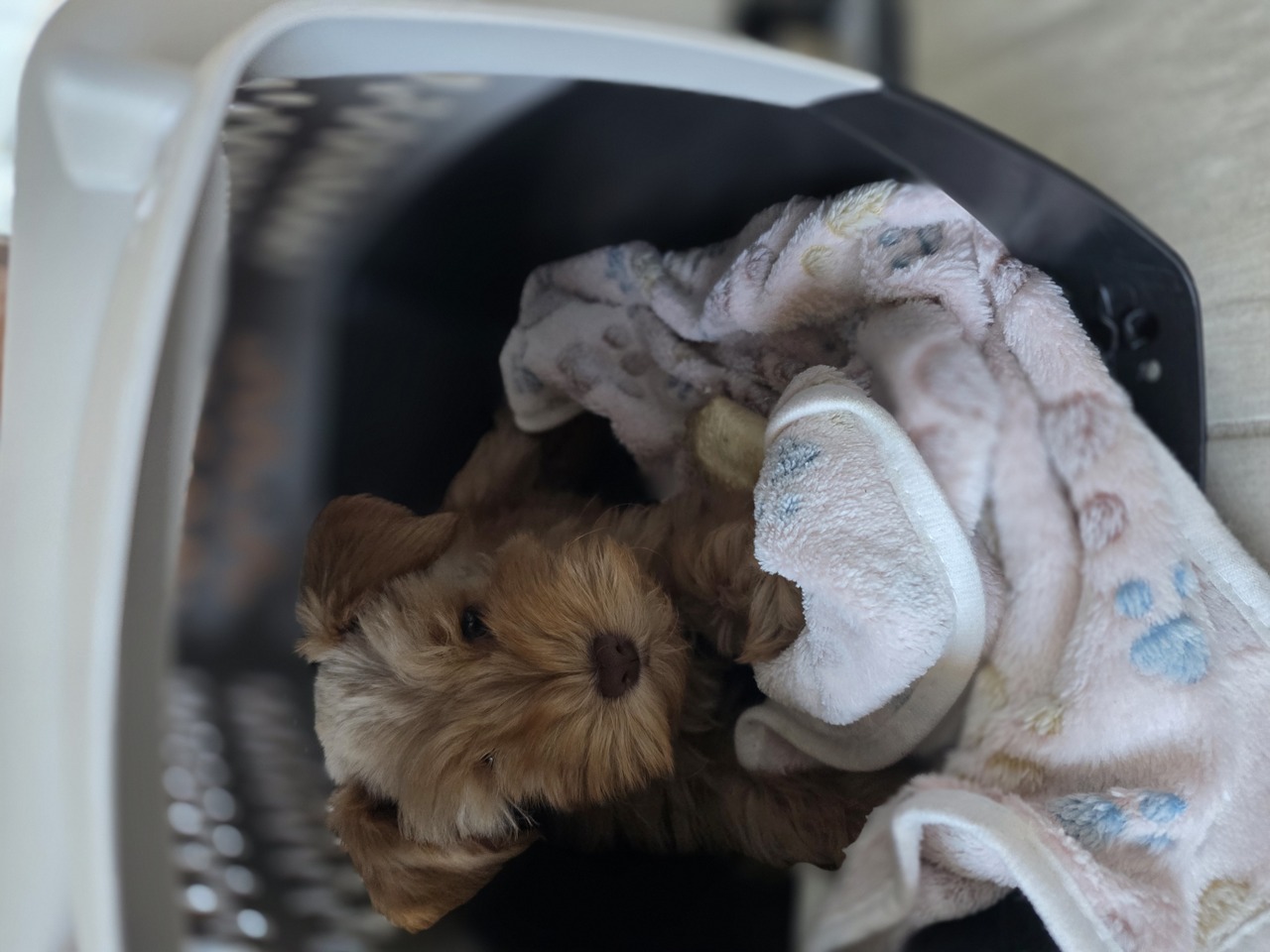 Crate sessions are short and positive, never forced or used for punishment. Puppies spend the majority of their time playing, exploring, and being held by our family, but they have brief, structured crate time to begin developing independence and healthy potty habits.